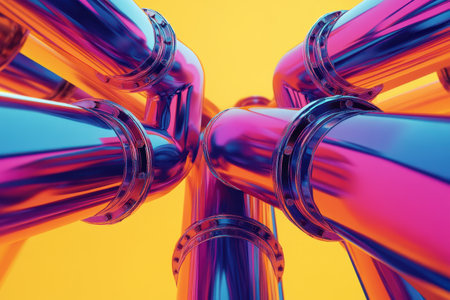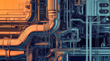 Complex arrangement of pipes and machinery highlights the artistry of industrial design through sleek lines and striking color contrasts.