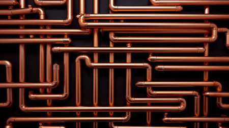 A row of sleek, polished copper pipes runs horizontally across a glossy black tiled wall. the metallic shine contrasts with the dark background, creating a modern industrial aesthetic suitable for interior design inspiration. Generative AI