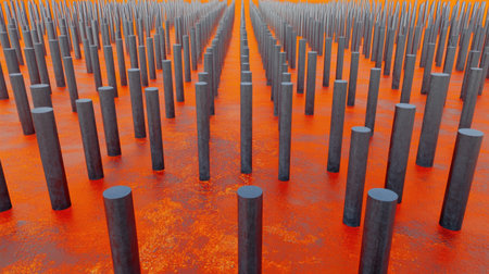 Three metallic pillars pointing the sky show from below