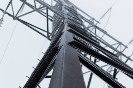 Closeup atmospheric photo of the perspective of the high voltage transmission tower covered with hoarfrost standing on the gray sky background after blizzard