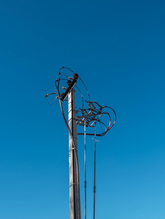 Photo of a concrete pillar with electric wires and sky on a sunny day with copy space
