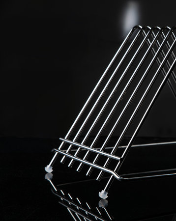 Metal equipment for drying dishes on professional kitchen. Selective focus. Shallow depth of field. Toned.