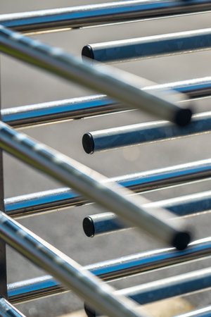a series of many metallic empty bicycle racks fading to soft focus in black and white