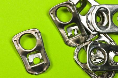 a pile of aluminum can tabs, also known as pull tabs or pop tabs. These tabs are the removable part of the opening mechanism on aluminum beverage cans.