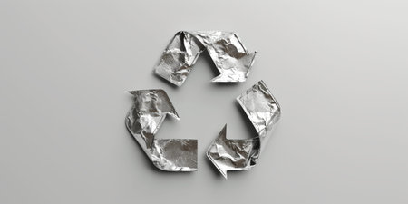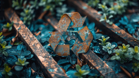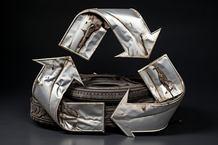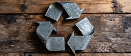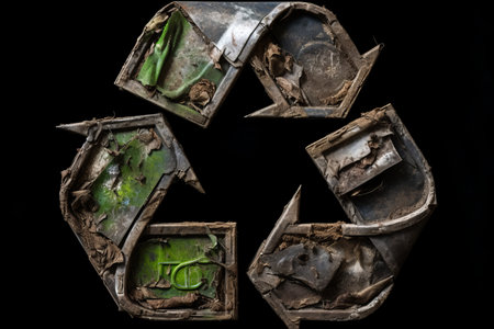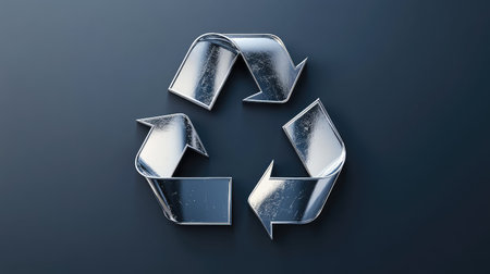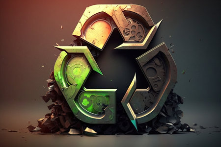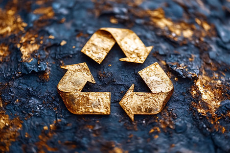 A shiny gold recycling symbol rests upon a rough dark surface, illustrating the need for environmental awareness. The contrast of colors emphasizes the significance of recycling initiatives.