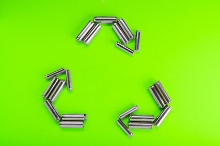 Use AA and properly dispose of batteries that are toxic to the environment and soil against a green background. The concept of technologies for processing hazardous and recyclable substances.