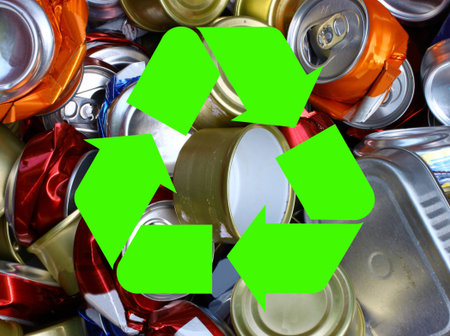 The international recycle symbolover top of a bunch of crushed aluminum cans