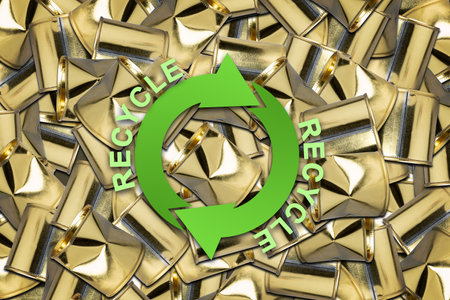 A green recycling symbol stands out on a pile of metal and plastic bottle caps, emphasizing the importance of recycling and sustainability.