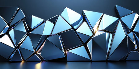 Geometric abstract background with modern blue metallic faceted triangles and shiny reflective surfaces creating futuristic pattern