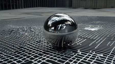 A polished metal sphere rests on a textured surface, showcasing intricate patterns and reflections. The modern architectural backdrop enhances the visual impact, creating a captivating harmony of design and form.