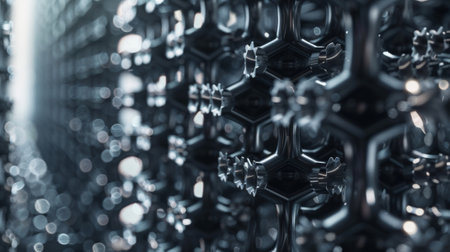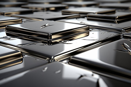 A captivating abstract composition featuring metallic structures with reflective surfaces, showcasing geometric patterns and intricate layouts. The image highlights a modern technology aesthetic with depth and artistic flair perfect for various creative projects.