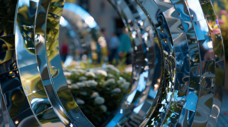The reflective surface of a mirrored installation creates a dazzling effect in this closeup shot distorting the surrounding environment