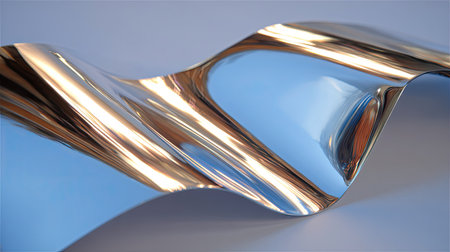 A stunning abstract image featuring a shiny metallic wave with smooth curves and reflections against a soft blue background, ideal for artistic projects.