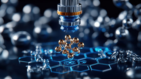 Laboratory equipment optical microscope, closeup of scientific microscope with metal lens, data analysis in the laboratory