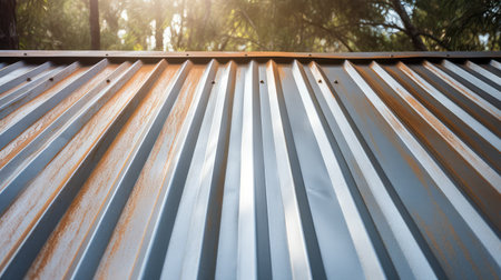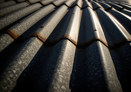 Weathered corrugated metal roof texture featuring strong diagonal lines, deep shadows, bright highlights, and visible rust along the seams. industrial, durable, and aged surface background.