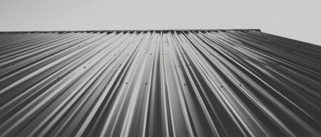 Corrugated aluminum roofing with metallic sheen and textured surface at a low angle