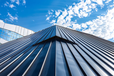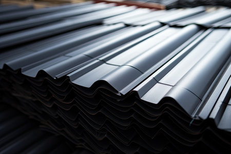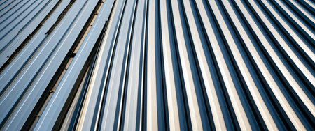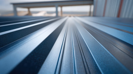 High-resolution close-up shot of metallic roofing panels showcasing sleek lines and reflective surfaces, ideal for construction and architectural themes, with natural light enhancing the detail.