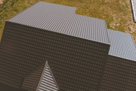 Modern roof made of metal. Brown metal tile on the roof of the house. Corrugated metal roof and metal roofing.