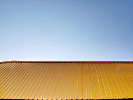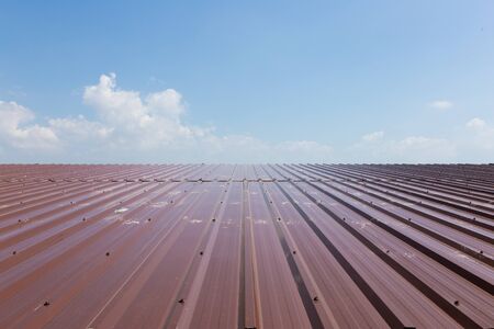 the factory building,the factory building made by sheet metal with the blue sky.The sheet metal roof of factory building with the sky.Close-up of the red factory building which made from sheet metal.