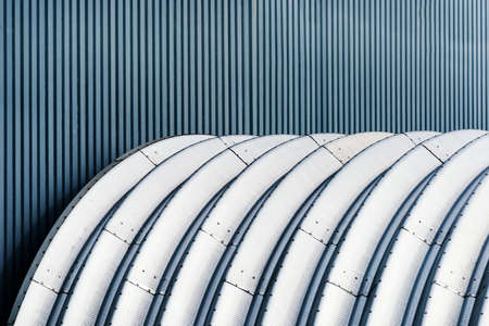 Black and white corrugated iron sheet used as a facade of a warehouse or factory. Texture of a seamless corrugated zinc sheet metal aluminum facade. Architecture. Metal texture.