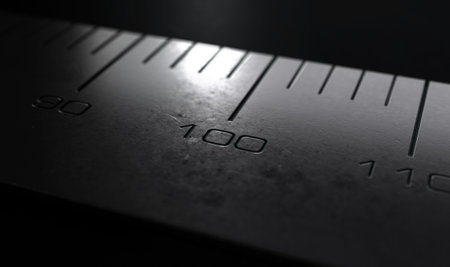 An extreme close up view of the number 100 section of an industrial steel ruler with engraved measurements on a dark moody background - 3D render