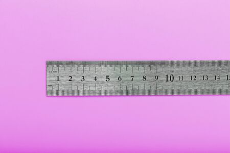 A metal ruler with a scale on a pink background is a superscape with a copy of the space for your text. Isolate