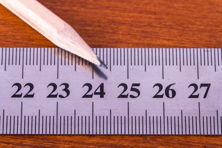 Close up view of wood pencil and steel ruler for engineering drawing on wooden table.