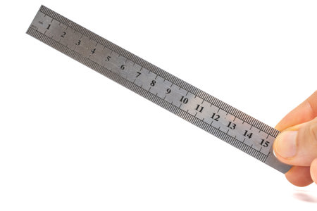 Hand holding a stainless steel ruler on isolated white background. 15cm metal ruler in hand. Precision measuring tool for length and drawing. Close-up