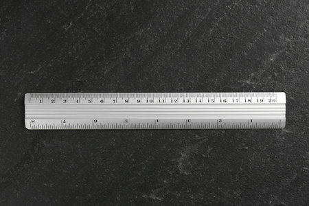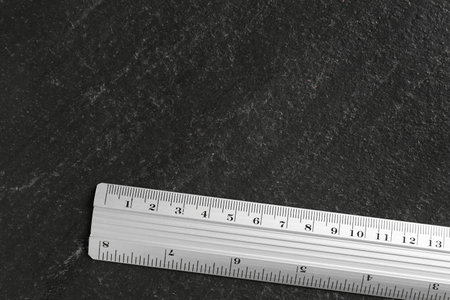 Black ruler isolated, inches, centimeters, millimeters, imperial and metric distance length units, cm and mm marks, detailed macro closeup, white numbers on plastics