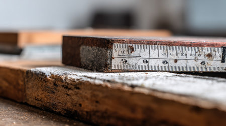 This image showcases a measuring tape resting on a wooden surface, surrounded by various construction materials in a workshop. Perfect for DIY projects.