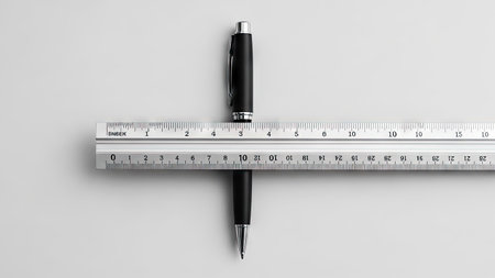 A black pen sits vertically atop a ruler in this image. The composition is straightforward, with clean lines and high-key lighting. The monochromatic scheme and precise alignment offer a sense of order. Suitable for use in design, education, or business contexts.