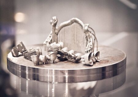 Object printed on metal 3d printer. A model created in a laser sintering machine close-up. DMLS, SLM, SLS technology. Concept of 4.0 industrial revolution. Progressive modern additive technology.