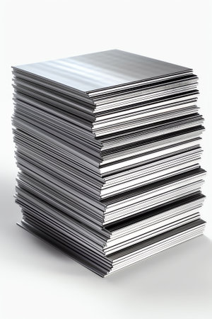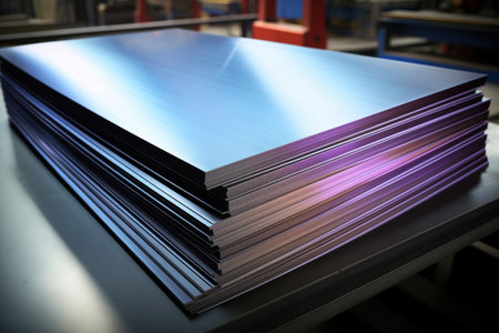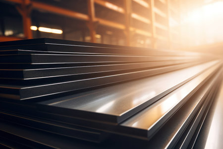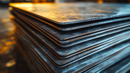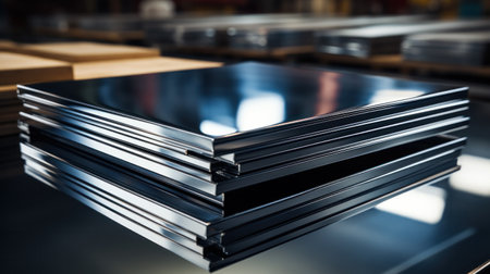 Stacked steel and aluminum sheets in an industrial factory setting showcasing manufacturing and engineering processes. Generative AI