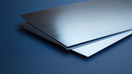 A striking arrangement of stacked metal plates showcases a smooth and reflective surface against a blue background, perfect for industrial concepts or artistic projects.