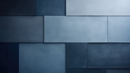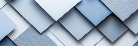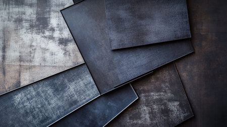 An abstract arrangement showcases various geometric squares and rectangles. The composition features diverse textures like brushed metal, patterned surfaces, and smooth finishes. The palette incorporates shades of gray, blue, and black, enhanced by subtle lighting. This imagery is suitable for backgrounds, design elements, and commercial projects.