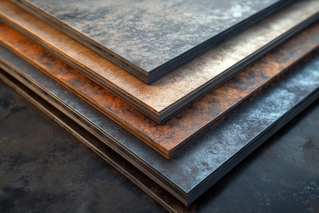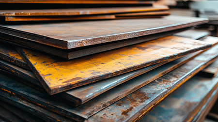 A captivating image of stacked rusty metal sheets showcasing an array of textures and colors, ideal for industrial, construction, and manufacturing themes.