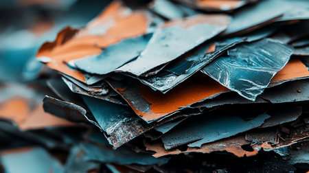 A macro shot reveals a textured stack of metal sheets, showcasing peeling blue and orange paint, rust, and corrosion, creating an abstract, industrial aesthetic.