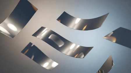 Several curved, reflective metallic strips float in a soft gradient background, catching light and creating dynamic...