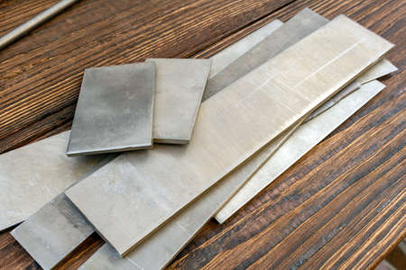 Titanium alloys plates bars pins stock hole tubing thong sheet for knife handle knife making materials supply on the brown wooden background