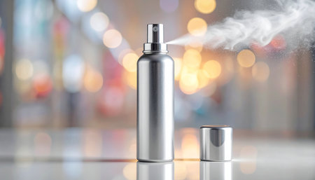 A silver spray bottle is actively dispensing a mist of liquid, with its cap resting nearby against a blurred background of colorful lights.