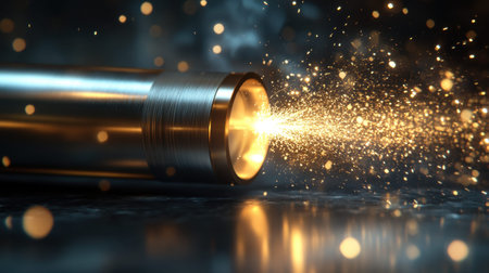 A mesmerizing close-up of a flashlight beam illuminating the darkness, creating stunning sparkling light effects, showcasing the interplay of light and shadow.