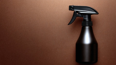 Black plastic spray bottle is positioned against a copper-colored background. The bottle is in a vertical orientation and shows a spray nozzle. The background has a textured surface. The image is well-lit and features high details of the bottle and its design elements.