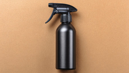 Matte black plastic spray bottle with a black spray nozzle is positioned on a tan colored, textured surface. The bottle is in the center of the image, and the background is plain, allowing the bottle to stand out.