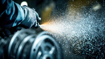 Closeup of a specialist spraying a metallic wearresistant layer onto automotive parts highlighting corrosion resistance and strengthened surface properties