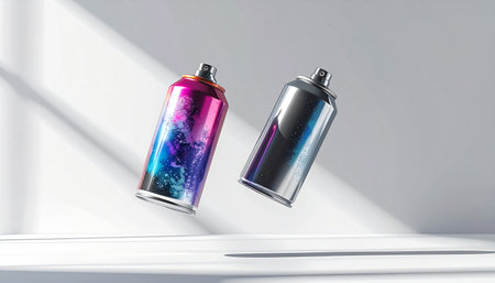 A striking of spray paint cans featuring metallic silver, lush green, and fiery orange hues, with the vivid green can sharply emphasized against a clean white
