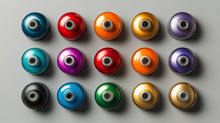 A captivating display of colorful round spray paint cans arranged on a smooth gray surface, showcasing vibrant hues for artistic inspiration and design projects. Perfect for visual art and home decor ideas.