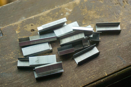 metal staples on wooden background