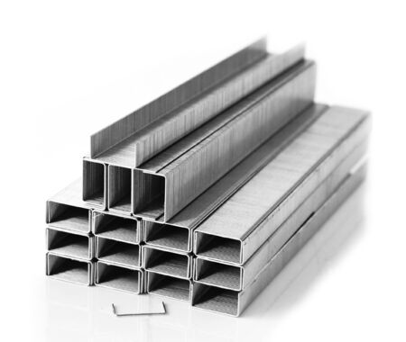 close up stack ofstaples on white background.