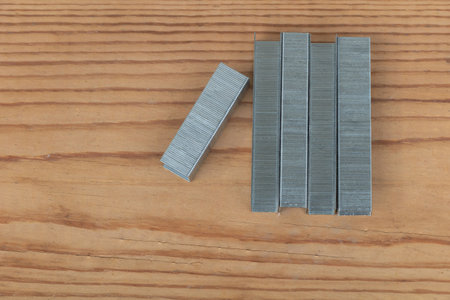 Metal staples for staple machine on woodenn background close up.