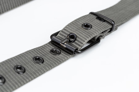 Metal buckle of a male gray textile belt on a white background close-up.